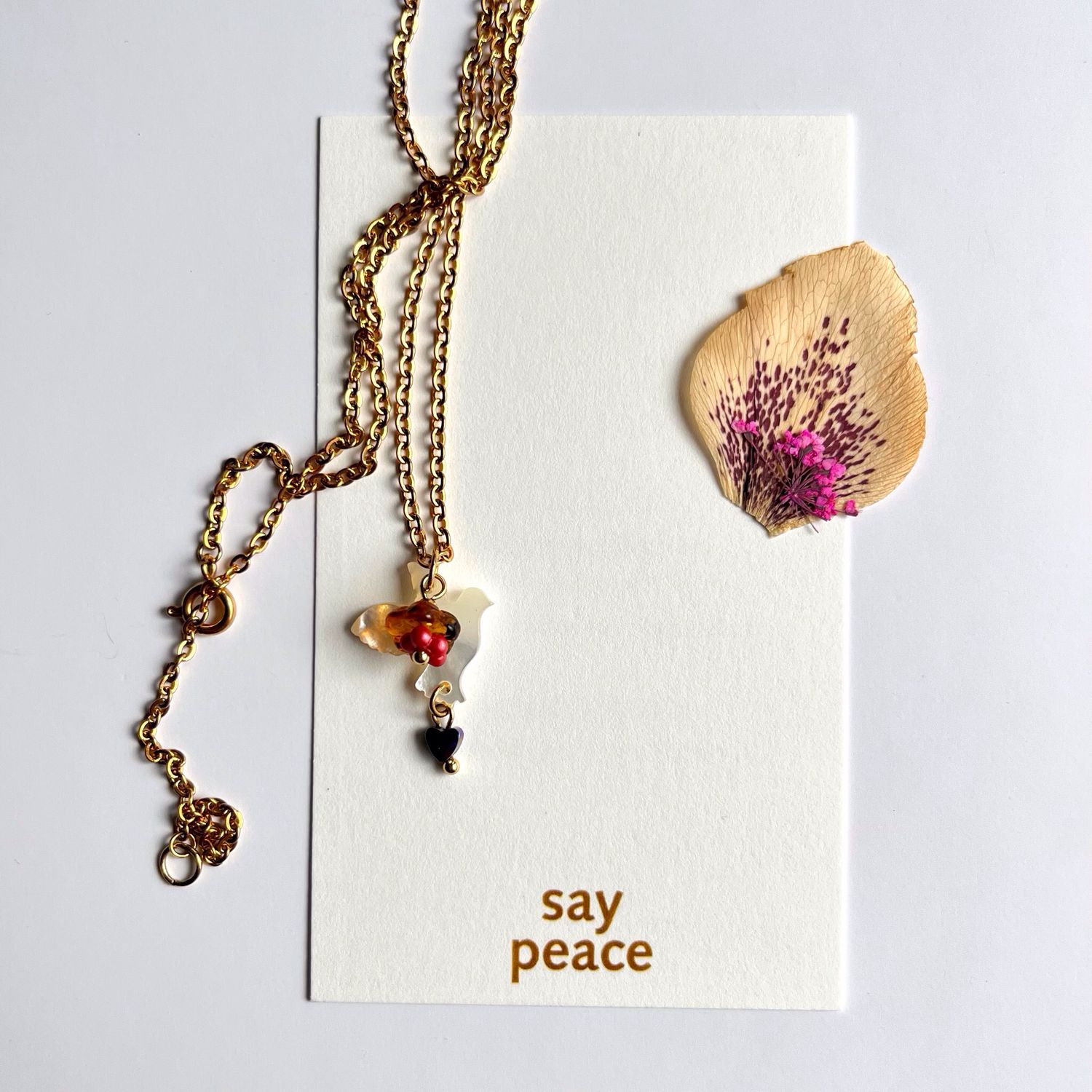 Het parelmoer vredes duifje is gemixt met een kleine schelp kraal en hematite kraal. Je ontvangt de ketting in een klein envelopje met een kaartje met de tekst: Say Peace.